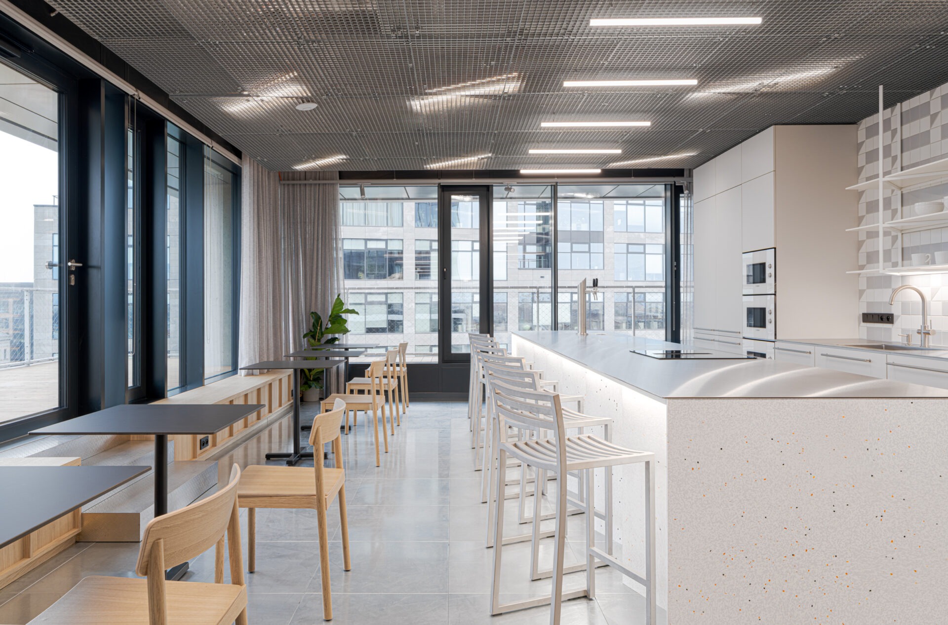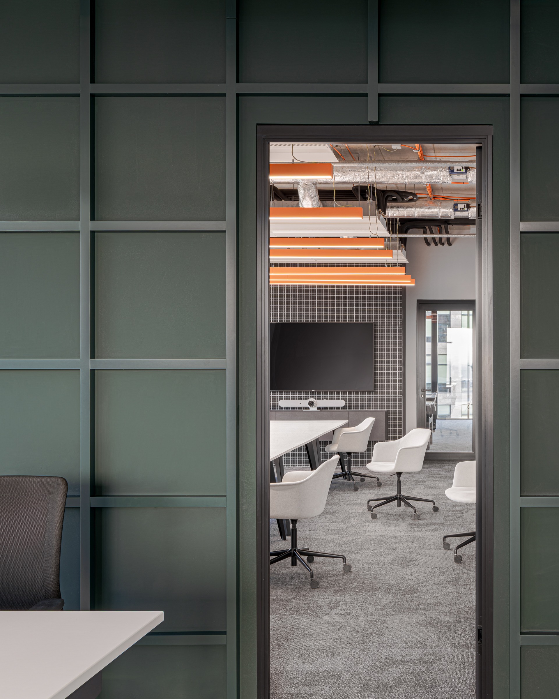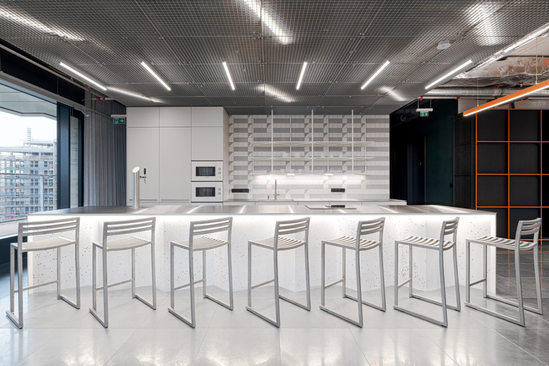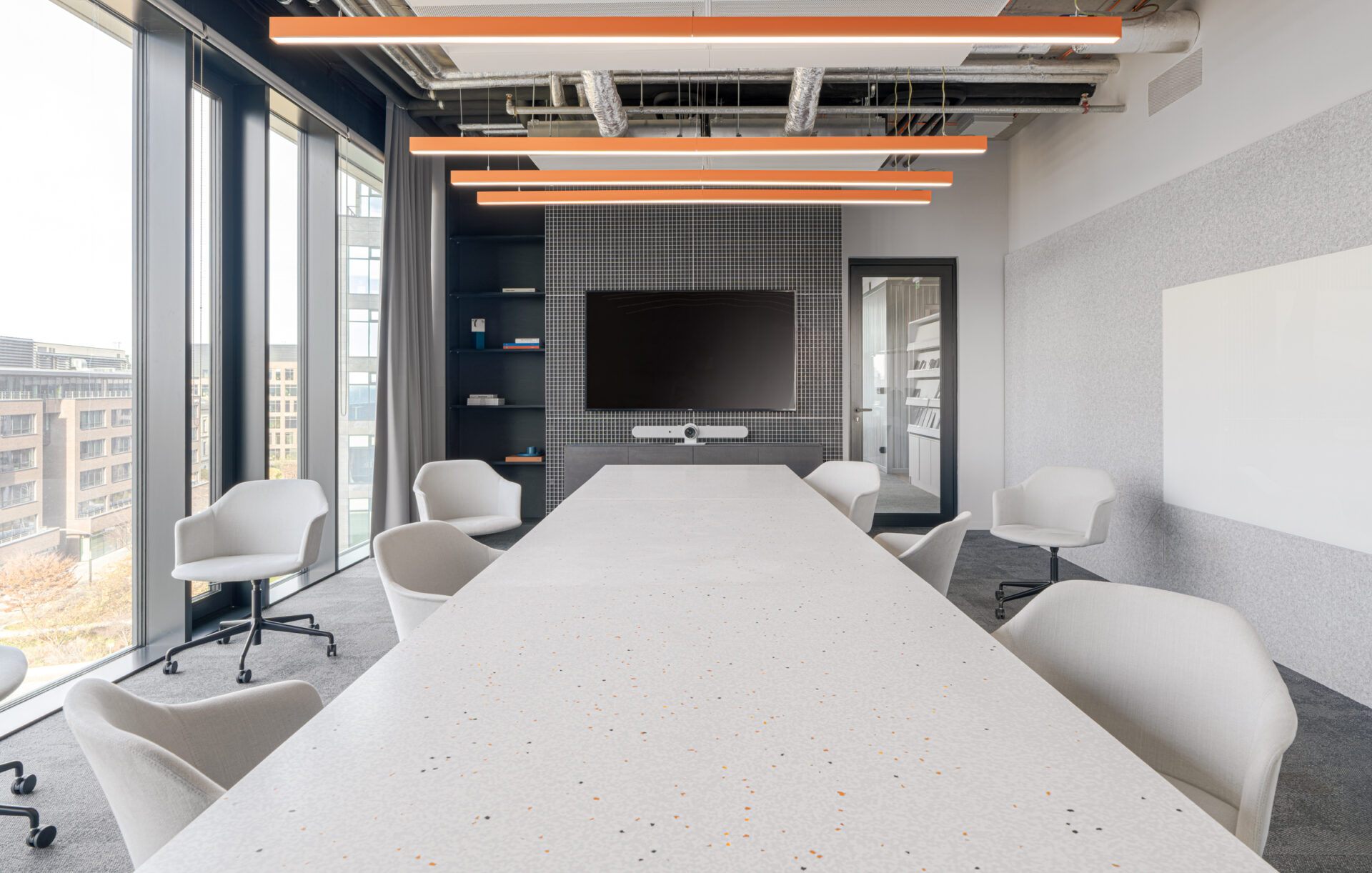 The centerpieces of the common areas became the bar counter and conference table made from Mínus® panels. For this project, we used the “White Dalmatian” texture from our catalog and created a special variant with a subtle blend of orange fragments.