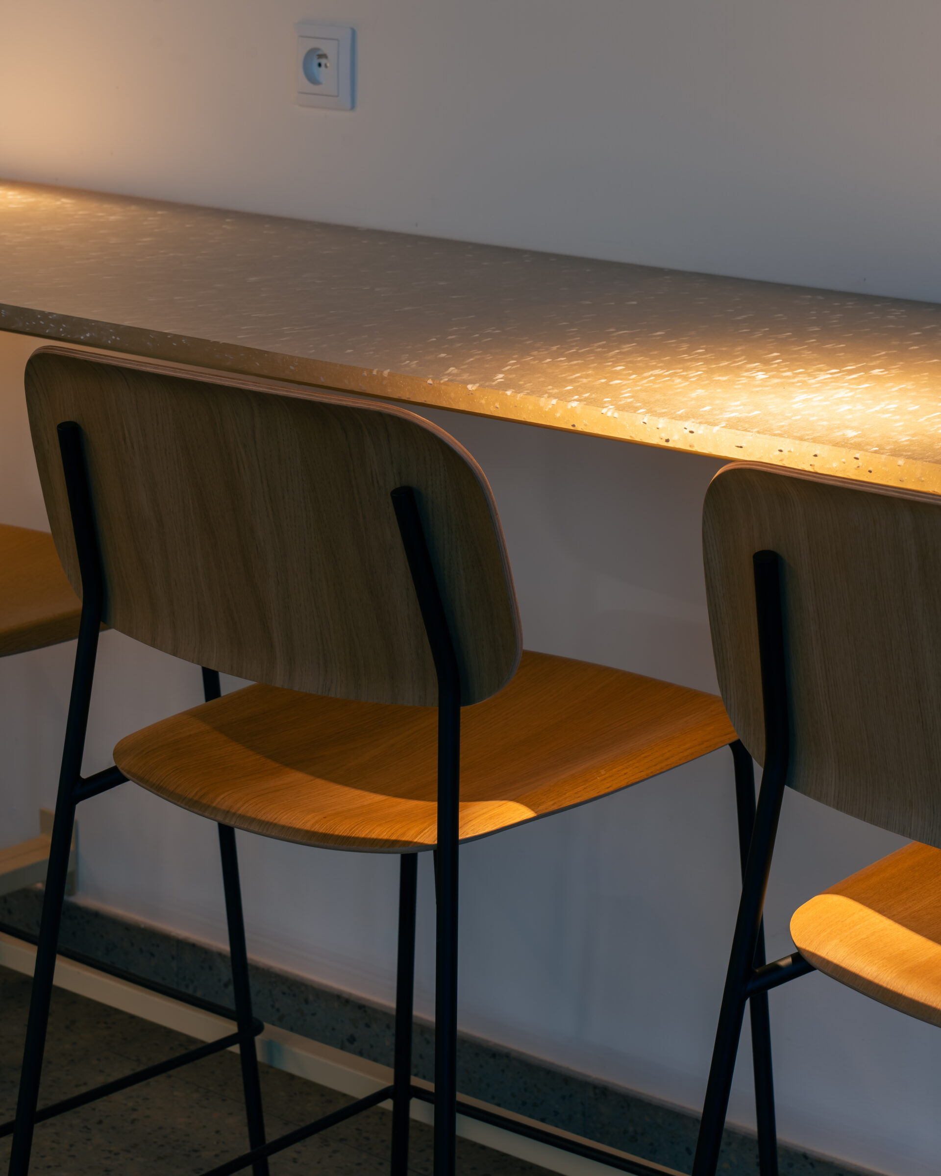 The collaboration with KRO Kitchen emerged naturally—from a shared need to find materials that make sense not only visually but also ethically. For the new KRO bistro in Prague’s Libeň district, Plastic guys panels were used for three tables and the bar counter—the focal points of any gastronomic space, where durability is key.