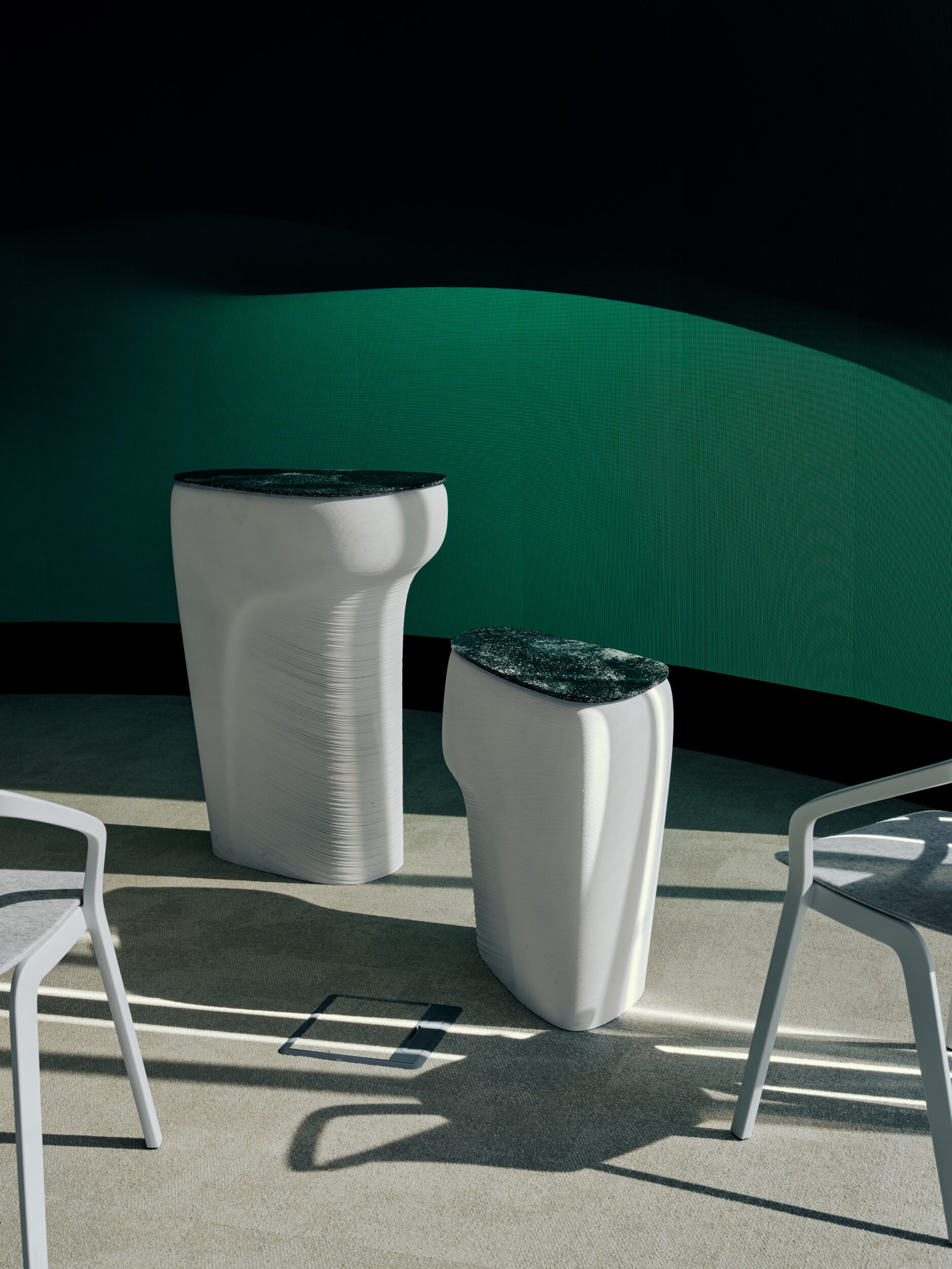 A key element of the design is large-format 3D printing, utilized on an unprecedented scale. This method was used to create ceilings, wall cladding, and a central meeting pavilion. Our Mínus® panels entered this hi-tech environment as a material partner, complementing digital production where maximum durability and tactile quality are required.