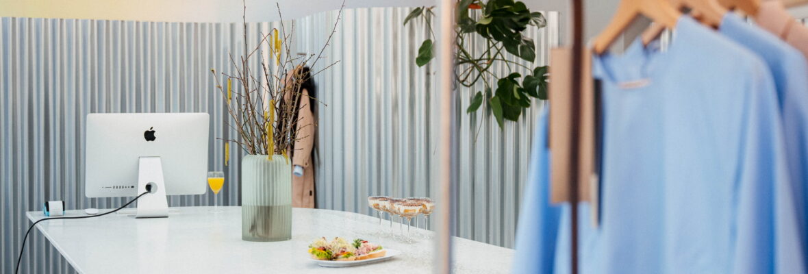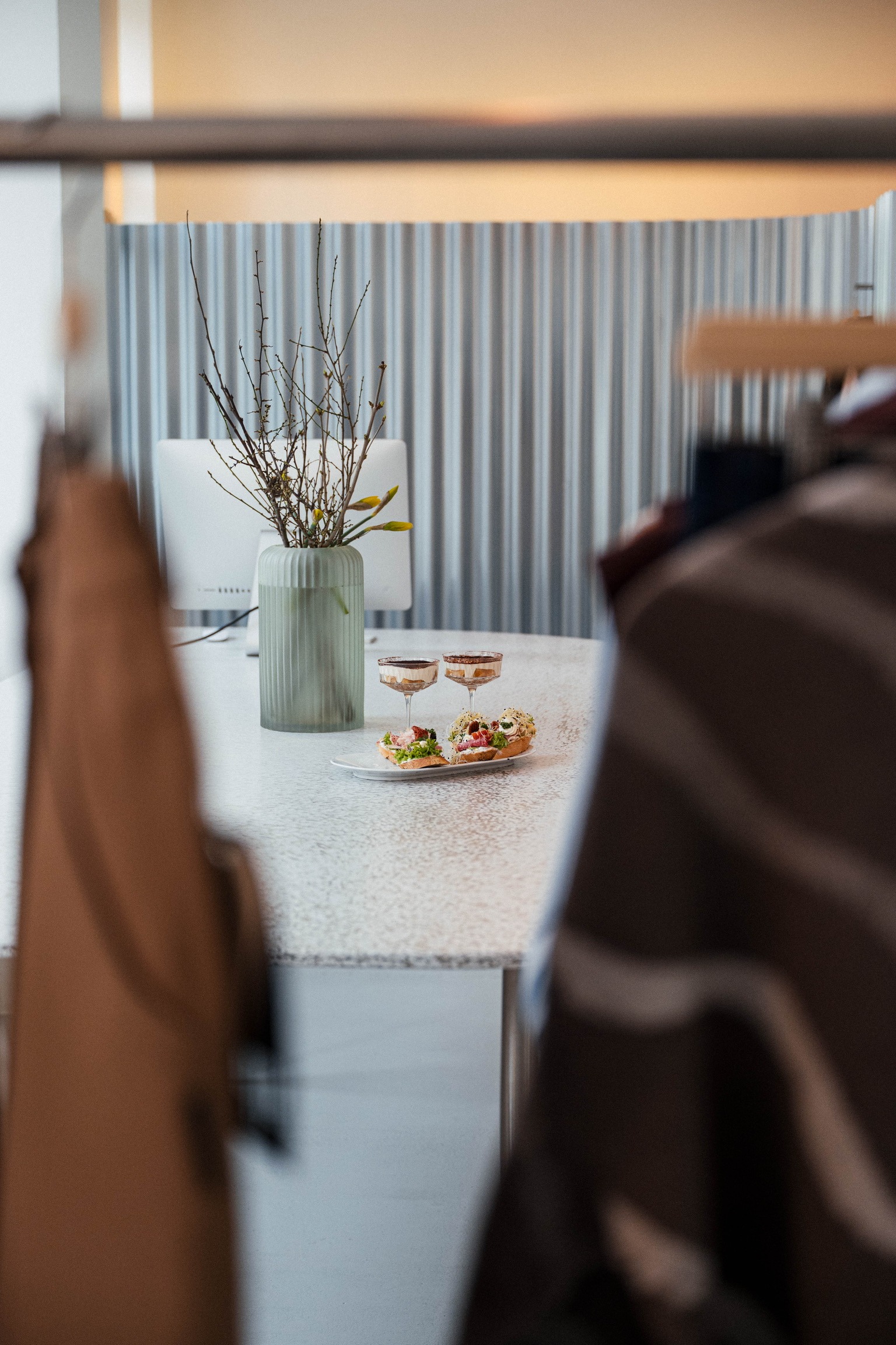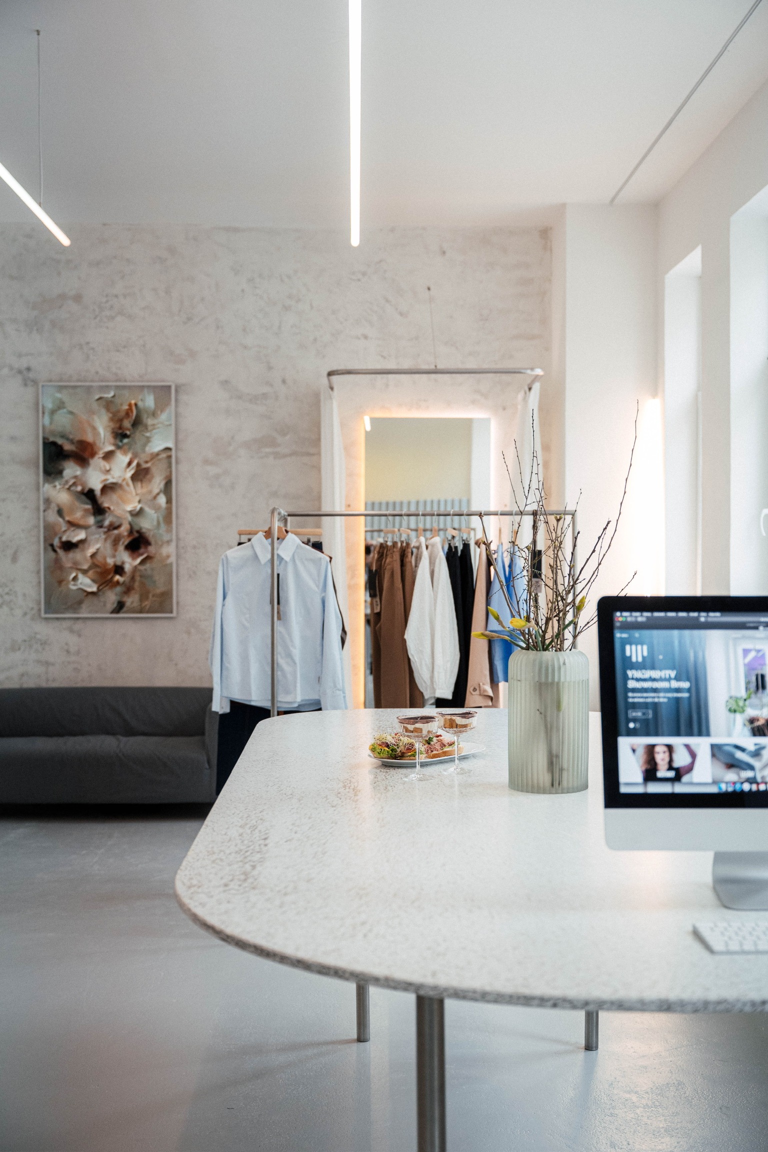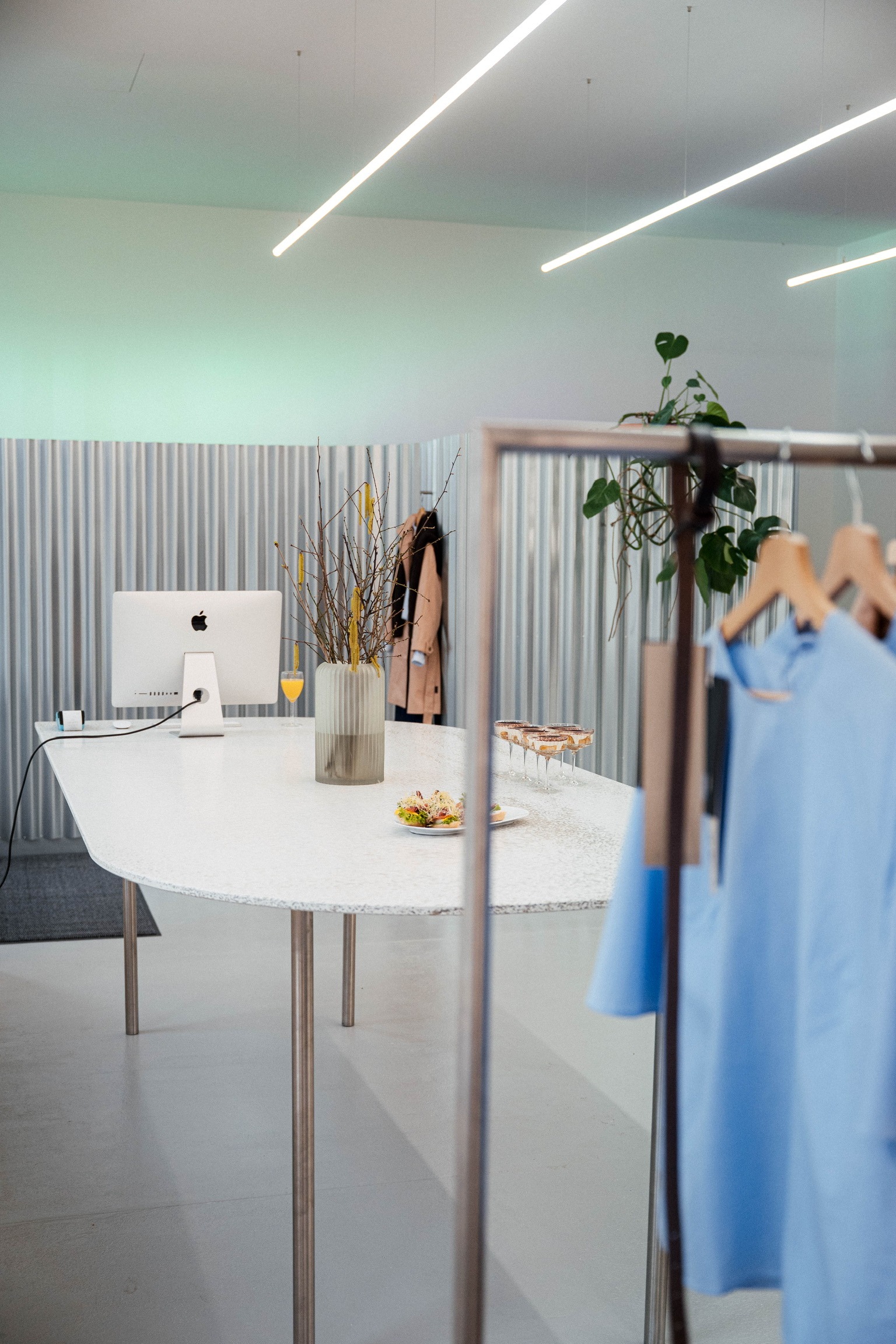 The panel texture, selected during a personal meeting, acts as an anchor in the showroom. The table serves as a platform for product installations, morning team meetings, and a place to discuss outfit details with customers. According to Filip, the table fits into the space so naturally that it doesn’t “scream” for attention, yet it is impossible to miss and incredibly practical for daily use.