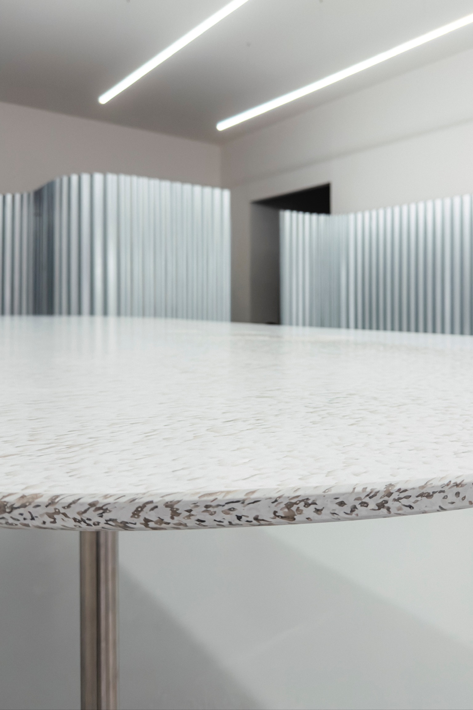 The centerpiece of the entire space is a large-format table and shelving made from Mínus recycled panels by Plastic guys.